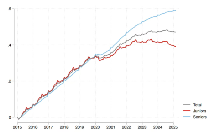 2015到2022年,初级岗位和高级岗位的就业曲线基本是手拉手往上走的,挺和谐。可到了2022年中,风向突变:高级岗位继续昂首挺进,初级岗位却停滞甚至掉头往下,两条线直接剪刀差开。偏偏这个时间点,正好撞上ChatGPT的发布,完美重合。